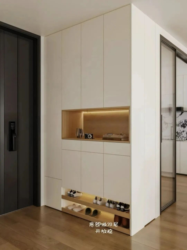 第二处“空”,底部也最好做镂空设计,专门用来收纳鞋子,鞋柜底部最好设计成“二层楼”式,下面放户外鞋,上面放家居拖鞋,这样每次换鞋就像开挂一样,不用弯腰,直接“拿得了、放得下”,既省时又省力。