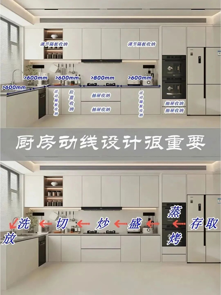 一个好用的厨房,无论是U型还是L型,都要遵循“取-洗-切-炒-盛”这一顺序,以确保我们在做饭时更顺手,更方便!