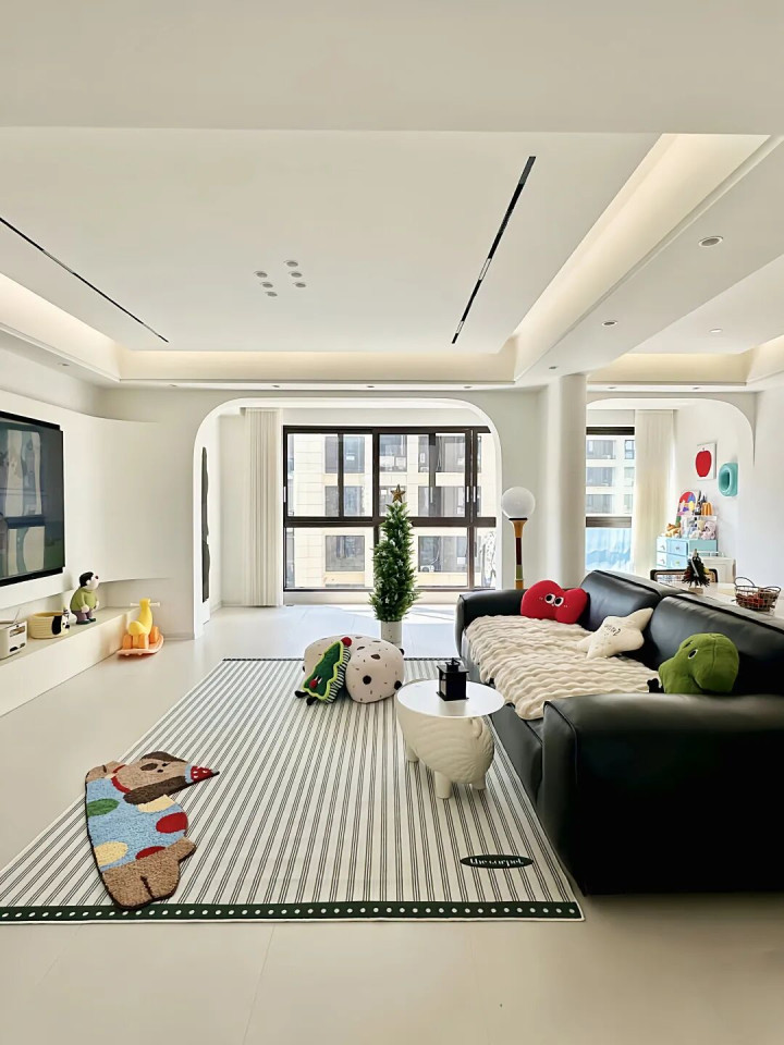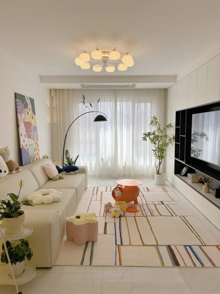 电视墙可以用柜子代替,直排沙发搭配一张大地毯,活动空间更大,孩子们也能尽情玩耍。等他们上学了,大人们可以在这儿做瑜伽、健身,随时变身为运动场。