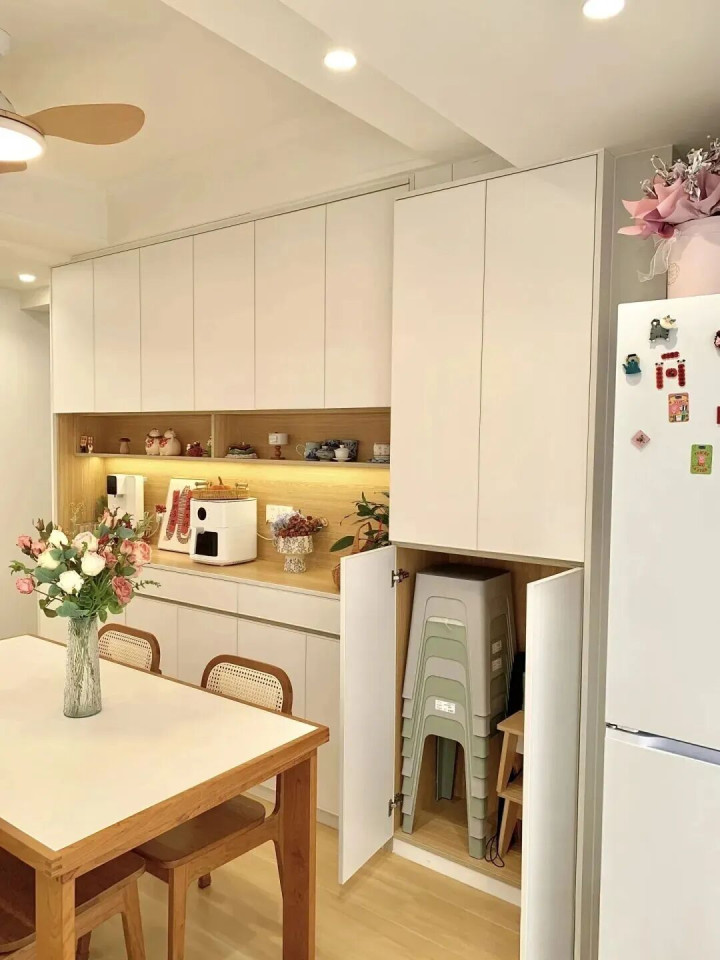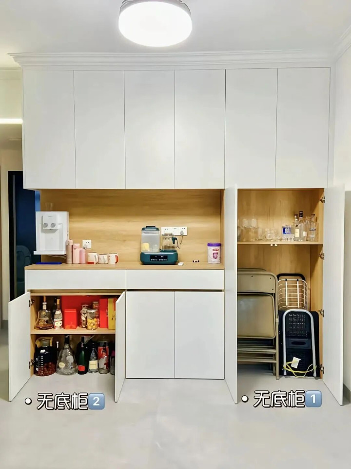 我有个朋友,她家装修时,把餐边柜两侧的底部全设计成了无底柜——既能藏凳子,又能轻松收纳瓶瓶罐罐的重酒类,直接推进去,省了“搬”的麻烦,想喝酒就轻松拿,不用弯腰,超级方便。