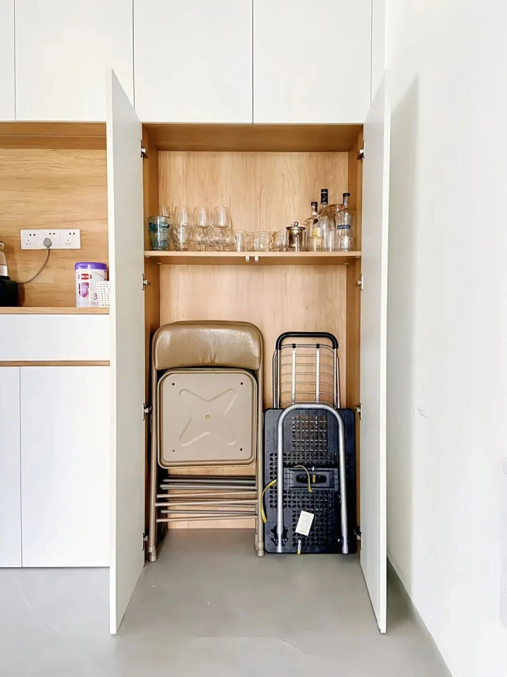 比如,餐边柜底部没板的话,我们可以用来收纳备用凳子等大物件用品。