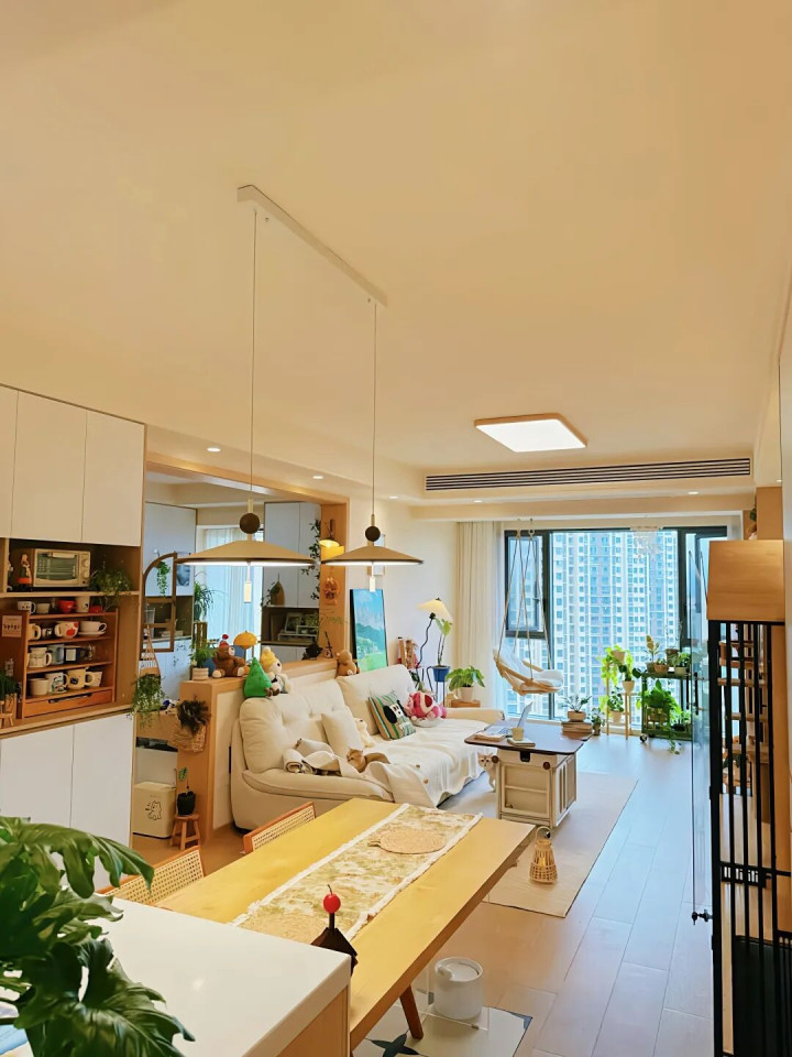建议:客厅尽量保持“空着”,沙发选直排款的就好,想要更“无拘无束”的话,可以选择去客厅化的设计。