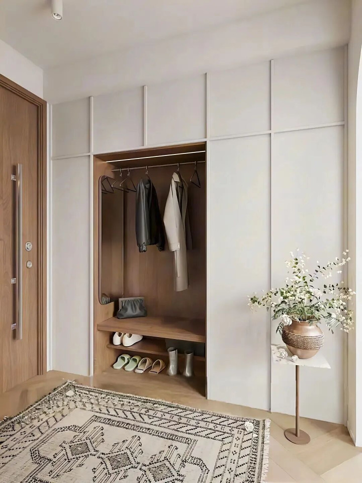比如玄关处有空间的话,咱就可以把鞋柜设计成带挂衣区的多功能神器,专门用来挂那些临时换下的外套。