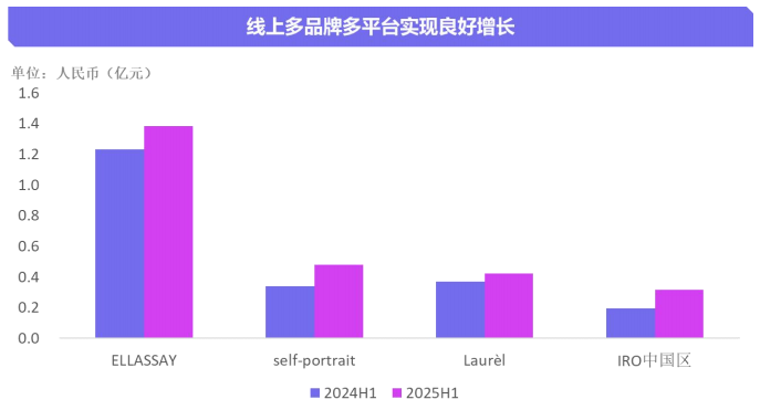从收入来看,各品牌在今年上半年“全面开花”:IRO品牌中国区延续线上超常规发展,抖音延续高速增长,小红书、视频号等新兴平台同步突破,推动线上整体收入增长超过60%;self-portrait品牌在抖音、天猫平台保持快速增长,带动线上销售同比增长超40%;Laurèl品牌在抖音平台实现大幅突破,线上销售增长14%;ELLASSAY品牌在天猫和抖音平台表现稳健,视频号直播规模实现快速突破,推动上半年线上收入同比增长13%。