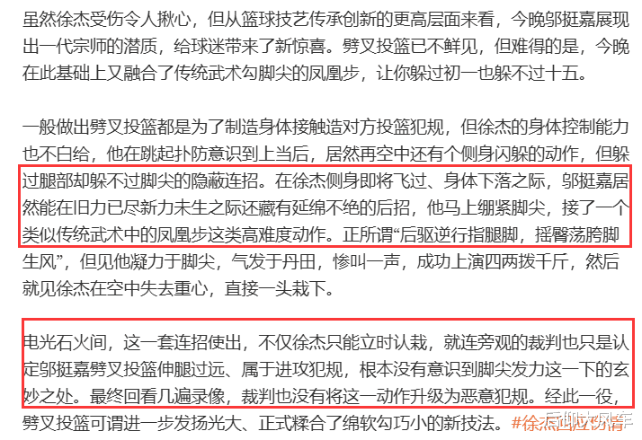 文章中指出,徐杰在空中有一个侧身躲避动作,但邬挺嘉却能在“旧力已尽新力未生之际还藏有延绵不绝的后招,他马上绷紧脚尖,接了一个类似传统武术中的凤凰步这类高难度动作”,这一招隐蔽的脚尖发力勾腿动作骗过了裁判,让裁判只能认定将其认定是普通的劈叉投篮伸腿过远,属于进攻犯规。