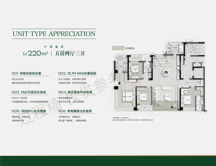 此次首开的两大户型,完美诠释了改善尺度。均为内外双玄关,全南向客厅设置,主卧转角飘窗增加采光,起步约170㎡户型,南向开间约12.9米,220方户型南向开间宽达18.7m,主卧套房面宽约4.5米带浴缸,全屋明卫设计更添实用。