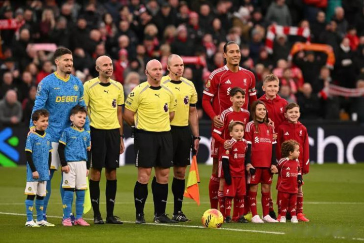 开球前,两个孩子作为护旗手,在利物浦队长范戴克和狼队门将若泽萨的陪伴下步入球场。