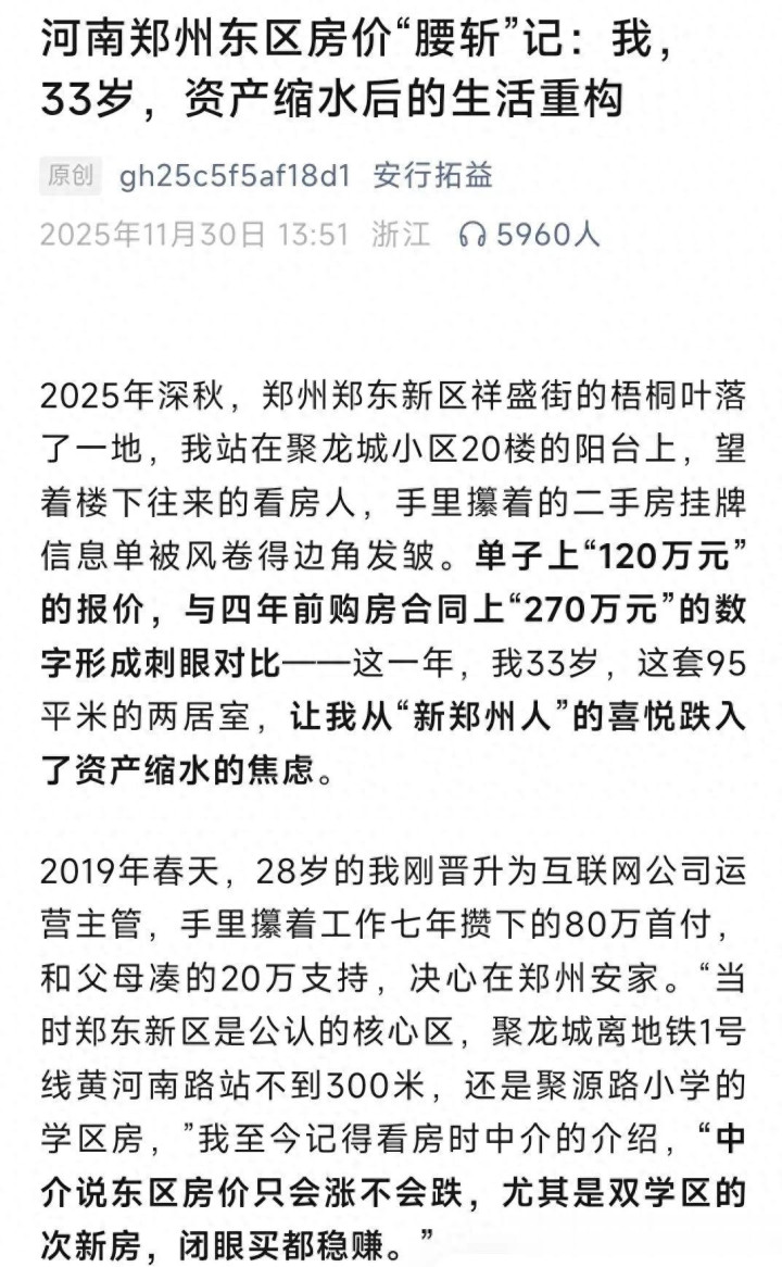 文章中几张刺眼的房价截图,直观呈现了郑东新区楼市的调整态势。其中重点提及的聚龙城小区,更是让我倍感熟悉——当年我工作的单位就在附近,每日通勤都会路过这片区域,如今看着屏幕上的挂牌价,难免心生感慨。